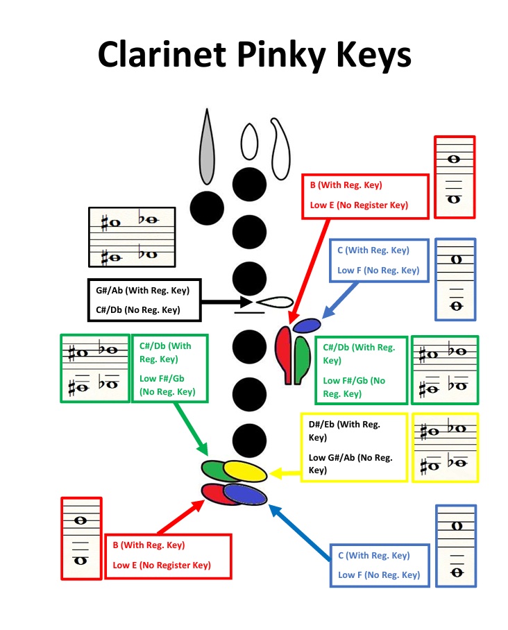 - Pinky Keys: Left or right pinky keys for E/B, F/C, F#/C#; right pinky only for G#/D# on a standard Boehm clarinet.